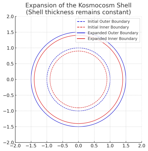 Comparing,the Universe to a thin rind or “watermelon skin,” in this analogy, the radial thickness of the physical shell could scale with the expansion. If expansion occurs isotropically at the speed of light in the radial direction, then both the outer and inner radii increase simultaneously, maintaining a constant thickness.